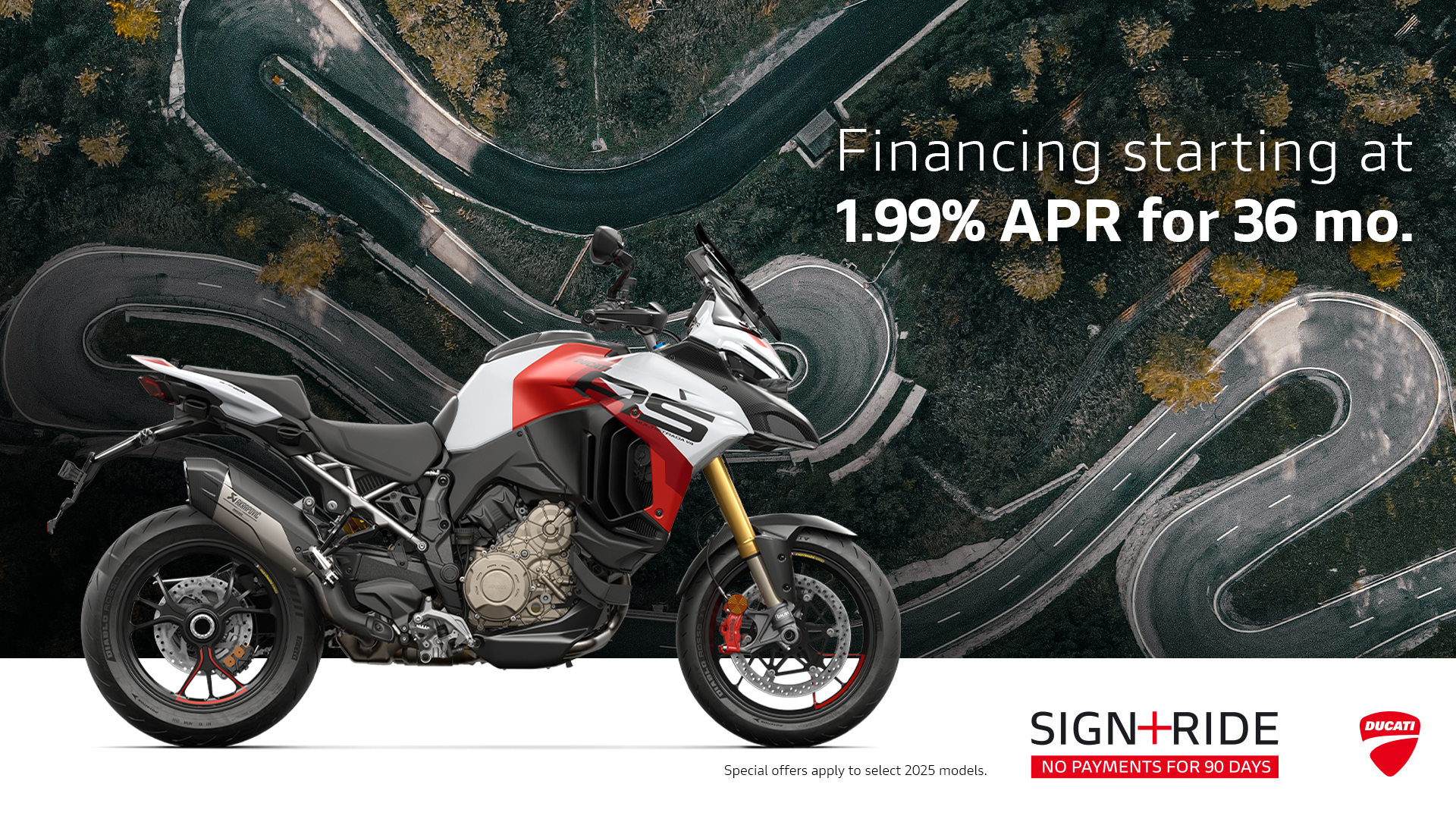 Offer available on select 2025 models to highly qualified customers on approved credit by Ducati Financial Services through participating and authorized Ducati dealers from January 6 - 31, 2026. Down payment requirement varies from 0%-25% of the purchase price based on credit worthiness. Not all customers will qualify for the advertised APR. Minimum amount financed is $5,000. See your local Ducati dealer for financing details or, for general product information, call 1-888-391-5446. VW Credit, Inc. dba Ducati Financial Services is a servicer for VCI Loan Services, LLC. © 2025 Ducati North America.